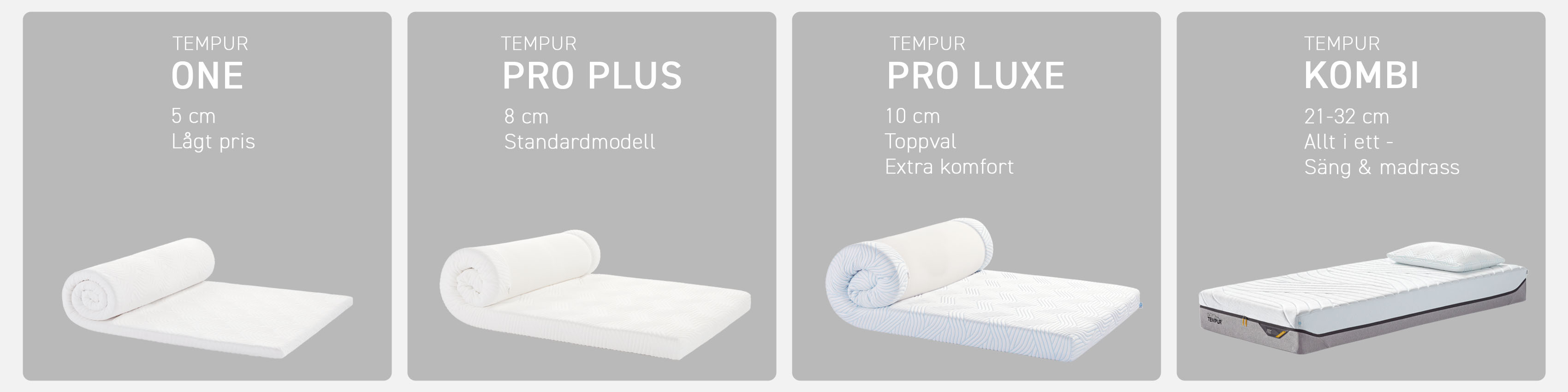 Bäddmadrass Pro Luxe SmartCool (svalt tyg) 10 cm Tempur 10270 kr Bäddmadrass Pro Plus 8 cm (utan SmartCool) Tempur 7890 kr Bäddmadrass One 5 cm Tempur 5999 kr Madrass Pro Plus CoolQuilt 27 cm Tempur 21242 kr