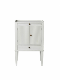 K.A ROOS Sofia -yöpöytä on elegantti kustavilaistyylinen yöpöytä, joka on valmistettu koivusta ja käsin maalattu aidon ja ajattoman ilmeen saavuttamiseksi. Antiikkipatinoitu pinta antaa huonekalulle sen klassisen luonteen ja viehätyksen. Yöpöytä on varustettu koristeellisilla, antiikkipatinoidusta messingistä valmistetuilla nupeilla, jotka viimeistelevät kokonaisuuden.